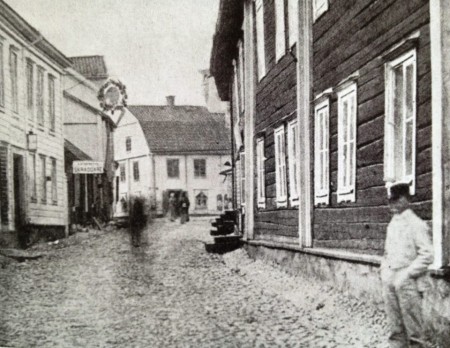 En av de äldsta bilder som finns från Norrtälje Tagen från Posthusgatan upp mot stora torget Året är 1864.jpg
